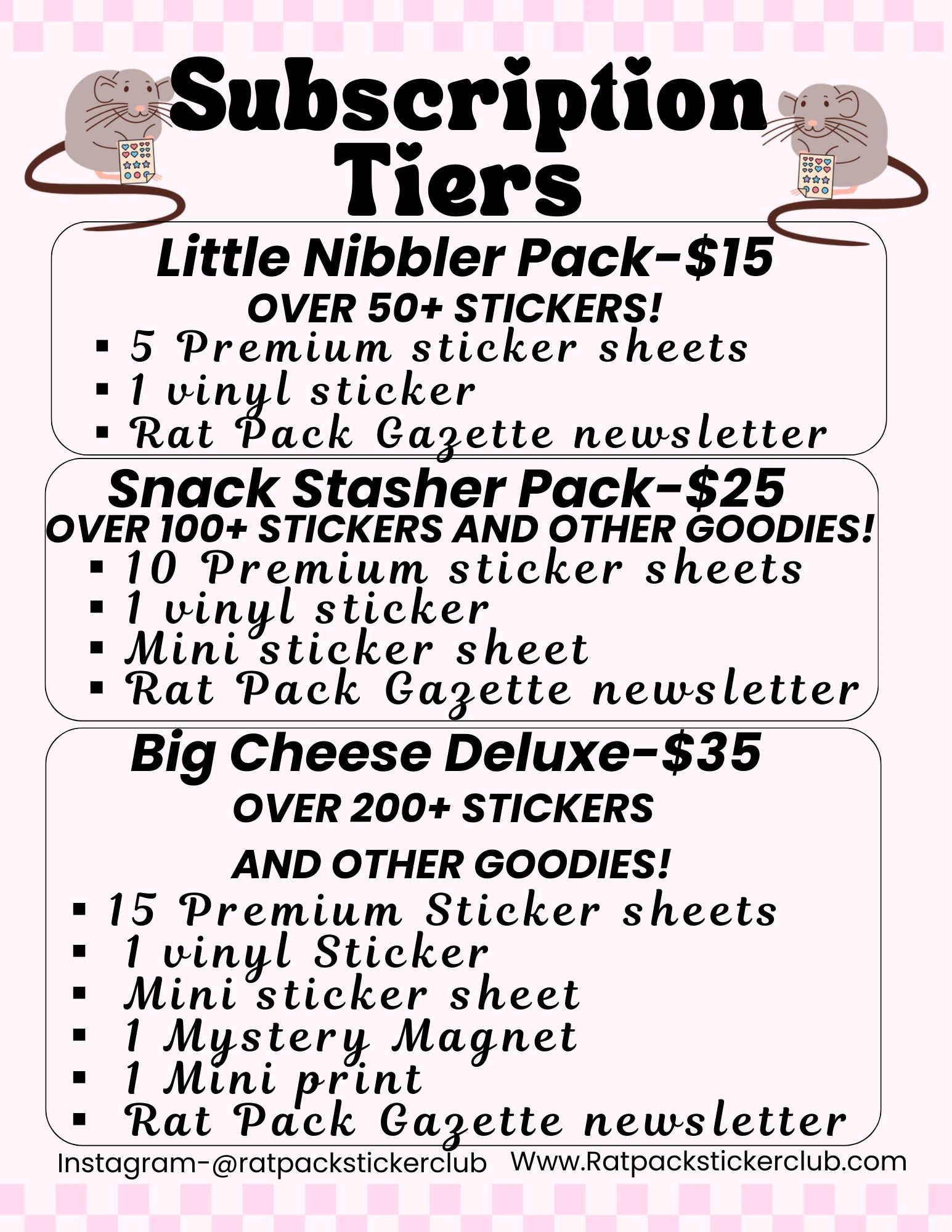 • Rat Pack Gazette newsletter(A sneak peek at next month’s sheet themes, fun micro-holiday facts,trivia, tiny ratvertisments,mini challenges, and other cute surprises.)
